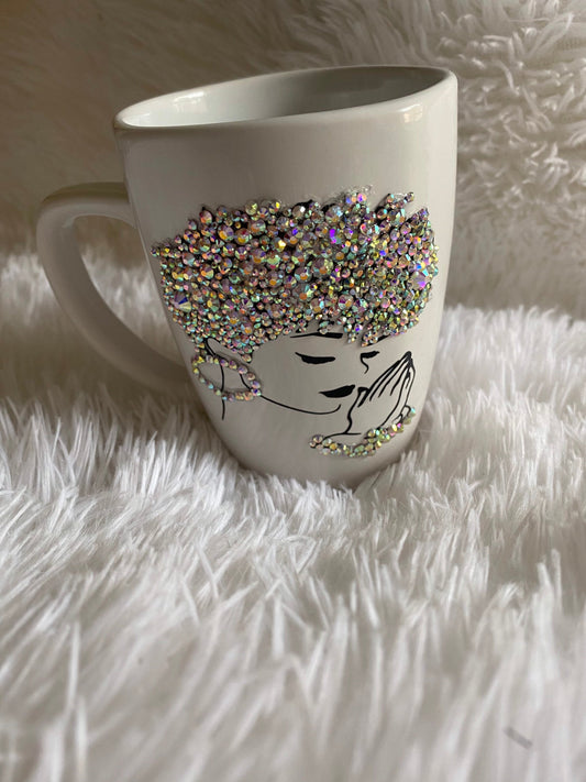 Bling Afro Praying Woman Mug: Rhinestone Christian Gift, 16 oz