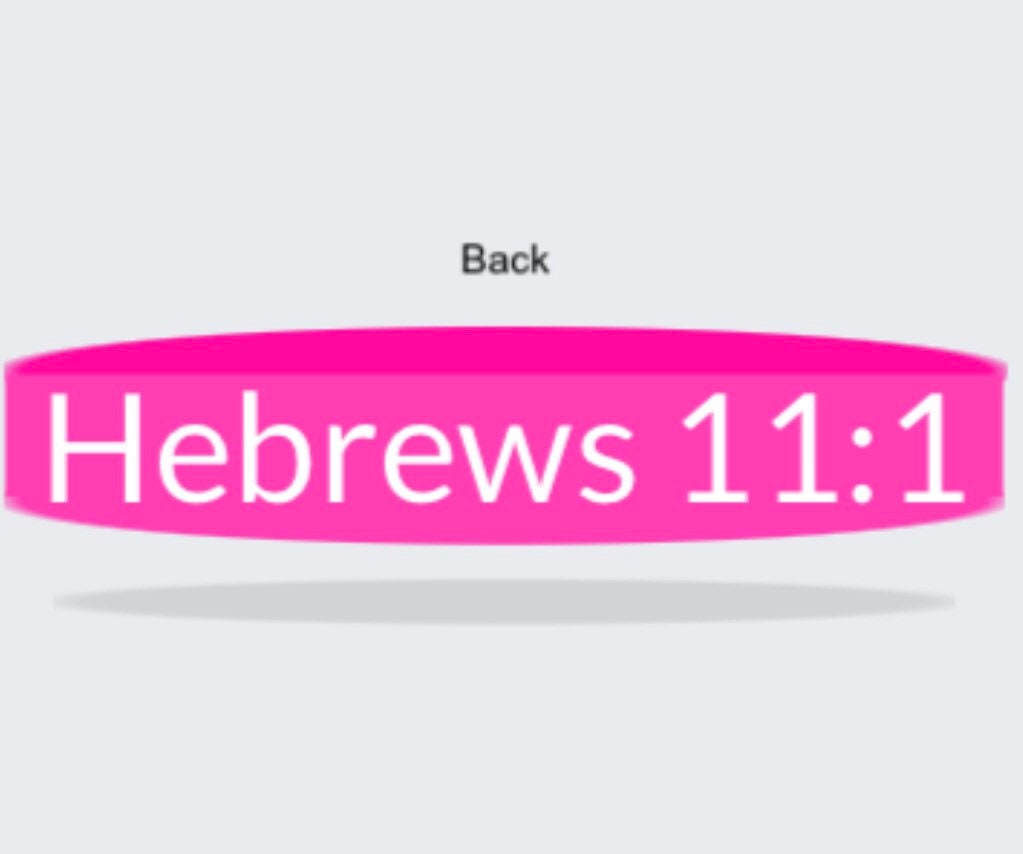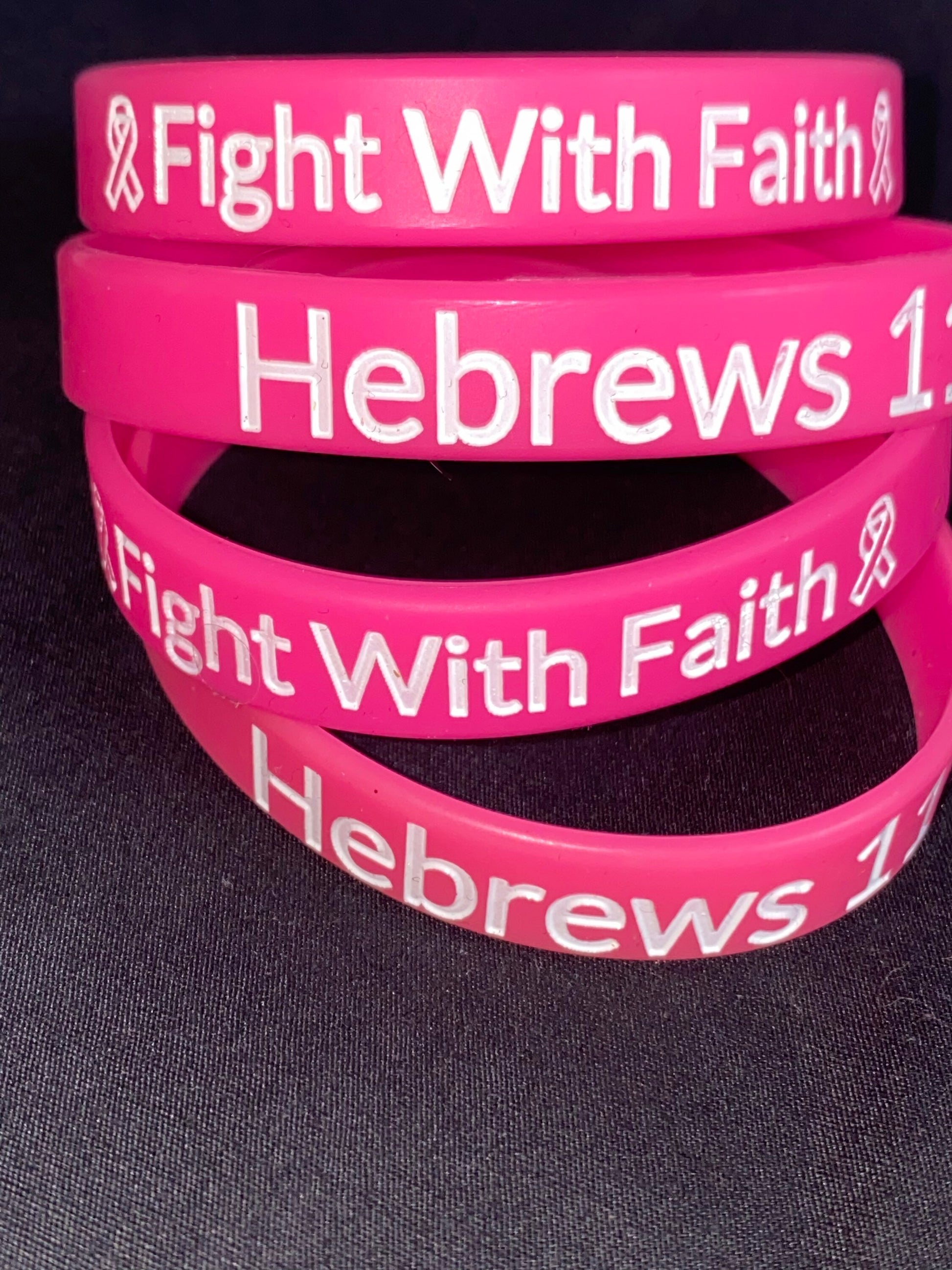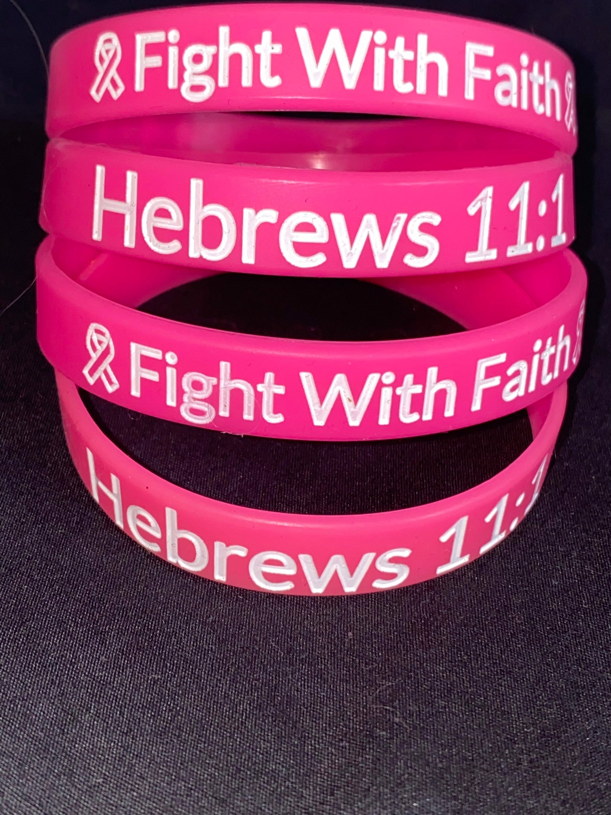 This pink silicone bracelet has the words “Fight With Faith” on the front and “Hebrews 11:1” on the back embossed on it with ribbons. The pink silicone bracelet is made of high quality silicone that you can see and feel. 1/2” wide